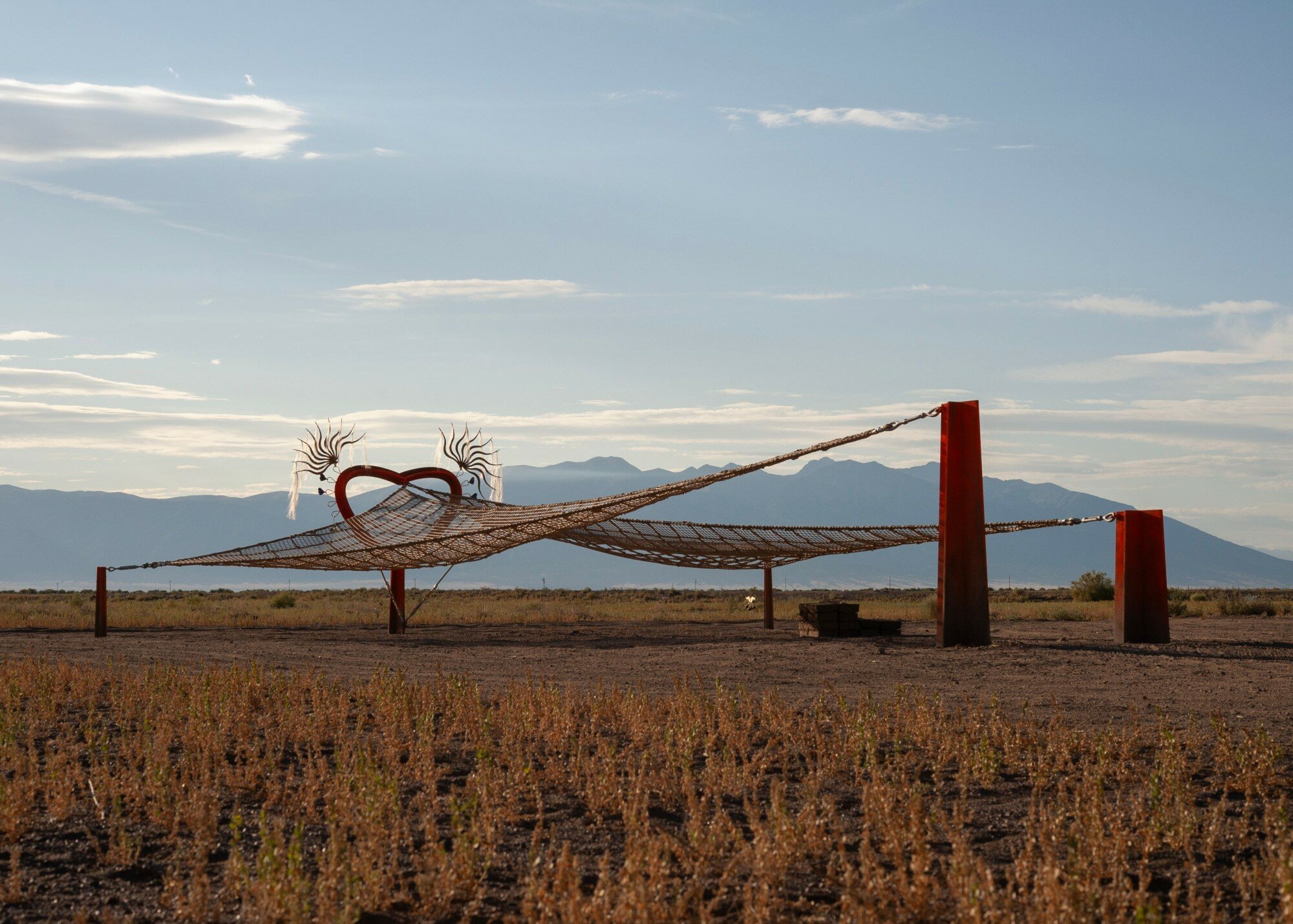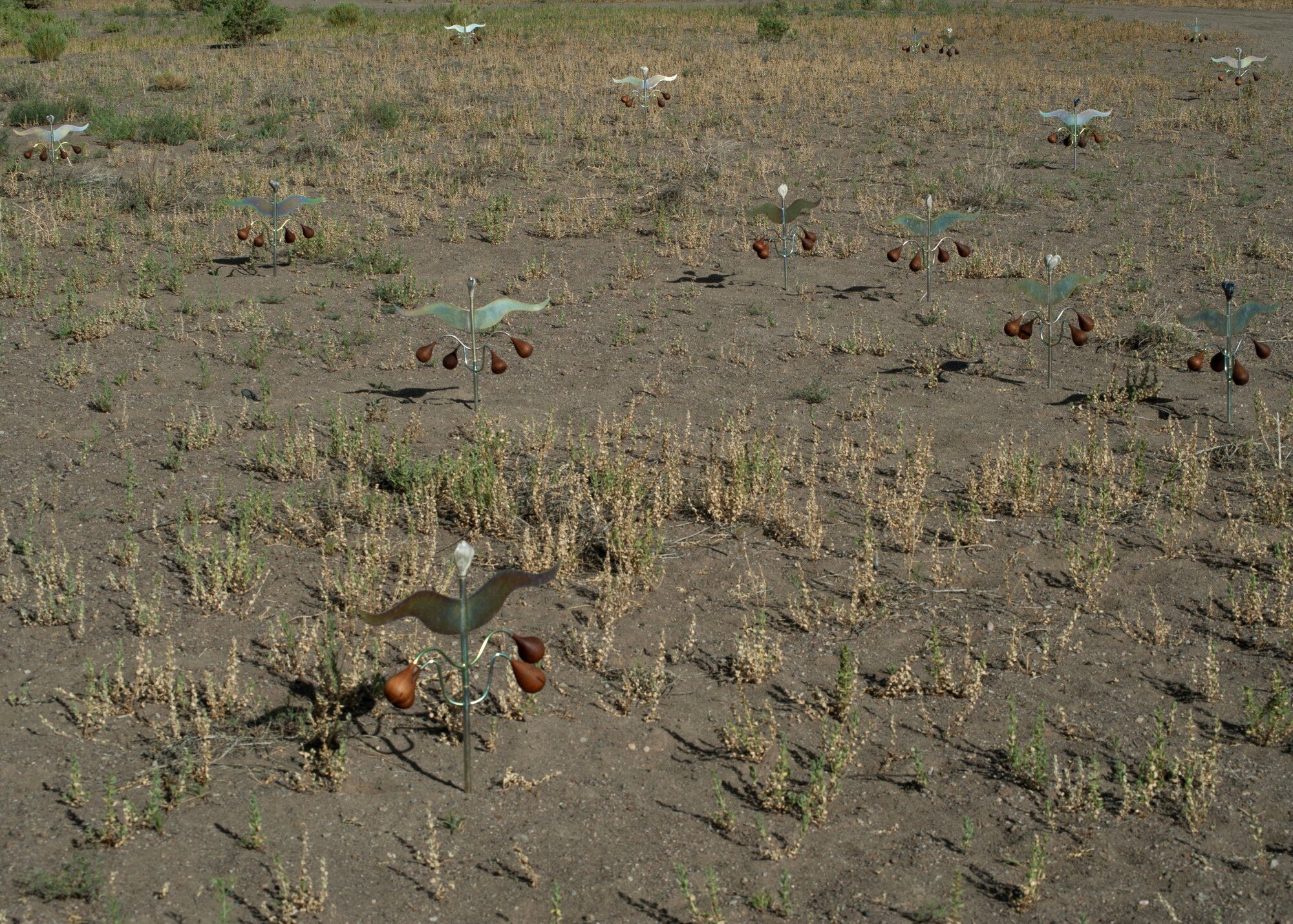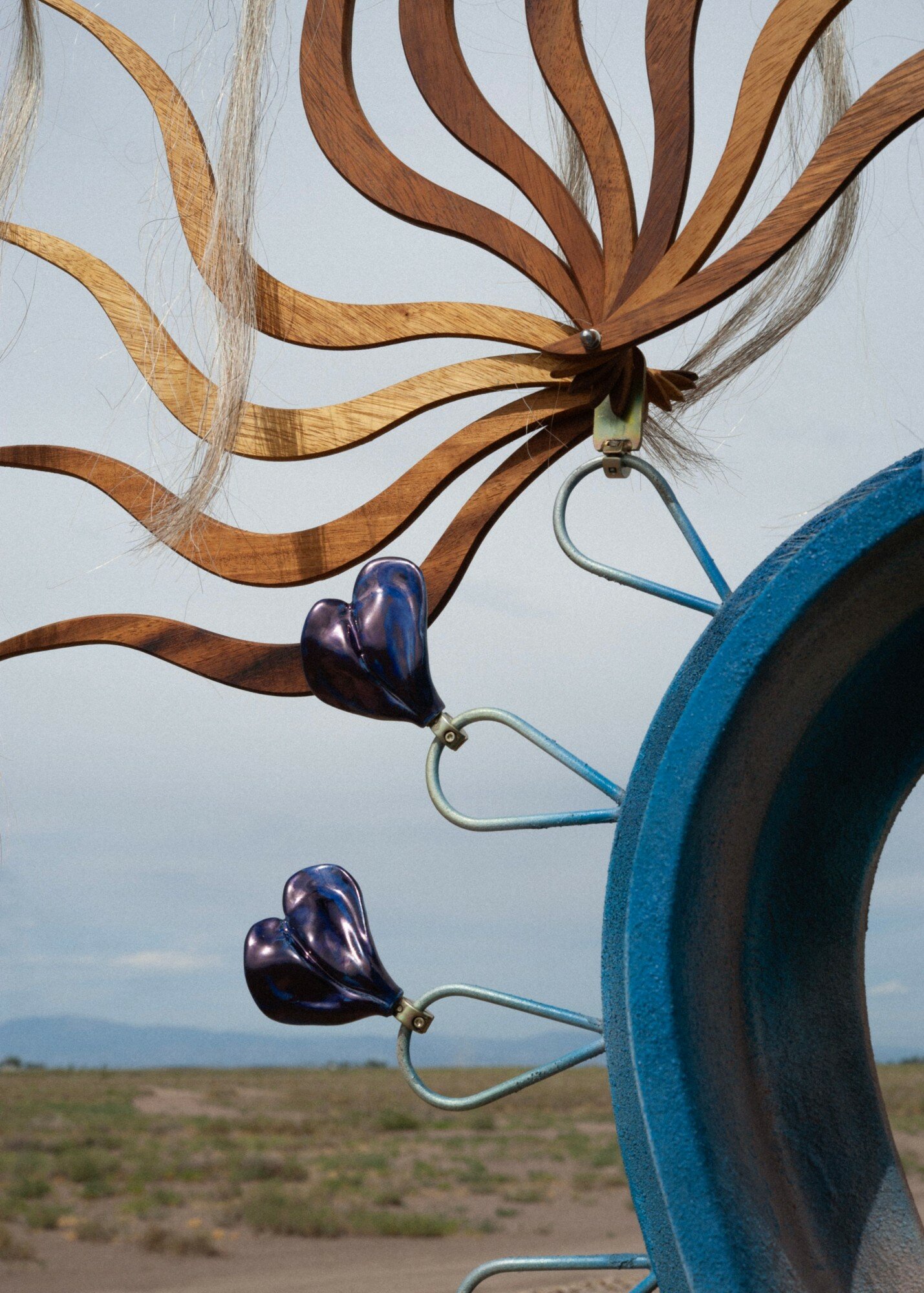 Marguerite Humeau’s Orisons is a subtle, 160-acre earthwork that transforms an unfarmable plot of land in Colorado’s San Luis Valley into a place of reverence, honoring its expansive history, existing ecosystem, and imaginable futures. Located in Hooper, Colorado, the work consists of the land in its entirety, as well as a series of eighty-four kinetic and interactive sculptures that invoke the land’s histories and vast network of interrelations. Dozens of whistling and rhythmic, plant-like sculptures inspired by the native and nomadic vegetation become activated by the wind, a legendary force in the valley, to summon the site’s energies. Also a part of the work are large-scale sculptures that hover over the ground and visually reference the outstretched wings of Sandhill Cranes, iconic birds that migrate through the region, which visitors can lay upon.
