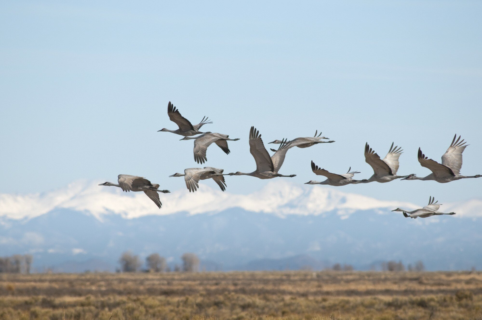 Sandhill Cranes flying through Colorado’s San Luis Valley during migration.